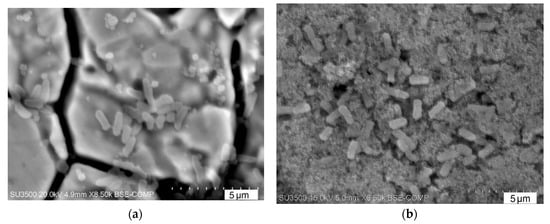 The analysis of the results of colonisation of the kraft lignin and kraft lignin/silica system carriers by the autochthonous strain of Gram-positive, sporulating Bacillus amyloliquefaciens bacteria isolated from digested sewage sludge showed that the isolate strongly colonised the surface of both carriers (see Figure 8). The cell biomass calculated according to the authors’ original procedure (Section 2.3) showed that the colonisation of the carrier with the predominant content of silica was much stronger. The cell biomass in the system with pure kraft lignin was 0.49 ± 0.03 g/100 mL, whereas in the kraft lignin/silica system it was twice as high, i.e., 1.05 ± 0.07 g/100 mL. The advantage of colonisation of the silica carrier can be easily noticed in the photo (Figure 8), and it was confirmed by SEM images (Figure 9a,b).
