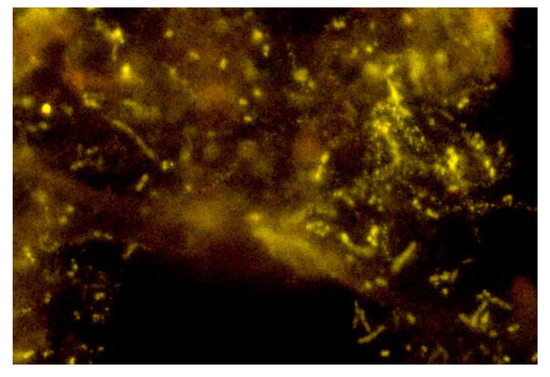 Specific identification of whole fixed bacterial cells with fluorescent oligonucleotide probes (FISH)—SS + kraft lignin/silica combination (400× magnification).