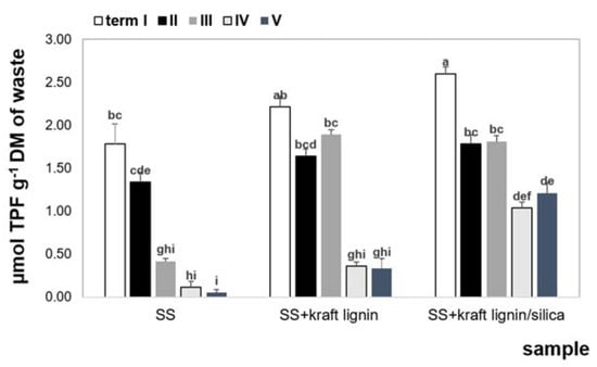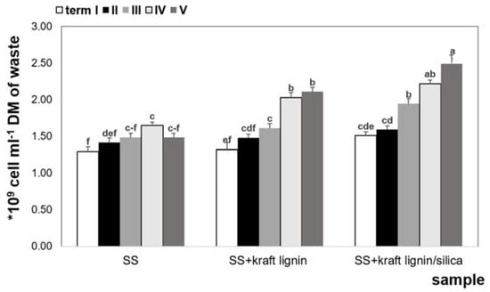 The addition of pure lignin also increased the count of bacterial cells in the digested waste (see Figure 11). However, the microorganisms did not react as intensely as in the combination with silica. There was a statistically significant increase in bacterial proliferation in the SS + kraft lignin variant only at the fourth and fifth terms of the analyses. It is most likely that this effect was caused by the slow transformation of lignin methoxyl groups into active functional groups (mainly-COOH), which are an easily available source of carbon for microorganisms []. As shown in the results from reference publications, lignin has very good sorption properties, and also works as a carrier for immobilising bacteria and enzymes [].