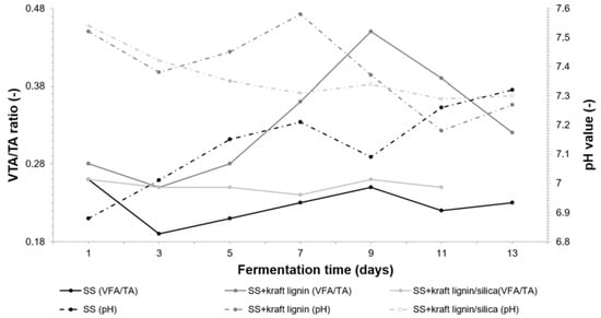 Changes in pH and the VFA/TA ratio during the anaerobic digestion of the SS, SS + kraft lignin and SS + kraft lignin/silica samples.