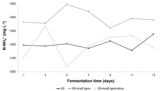 Changes in the N-NH4+ level during the anaerobic digestion of the SS, SS + kraft lignin and SS + kraft lignin/silica samples.