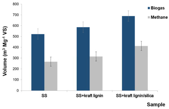 - During the continuous anaerobic decomposition of three samples based on sewage sludge, the largest amount of biogas was produced from the SS + kraft lignin/silica system (689 m3 Mg−1 VS, including 413 m3 Mg−1 VS methane). There were comparable amounts of biogas produced from the SS sample (526 m3 Mg−1 VS biogas, including 51% methane) and the SS + kraft lignin sample (586 m3 Mg−1 VS biogas, including 54% methane).