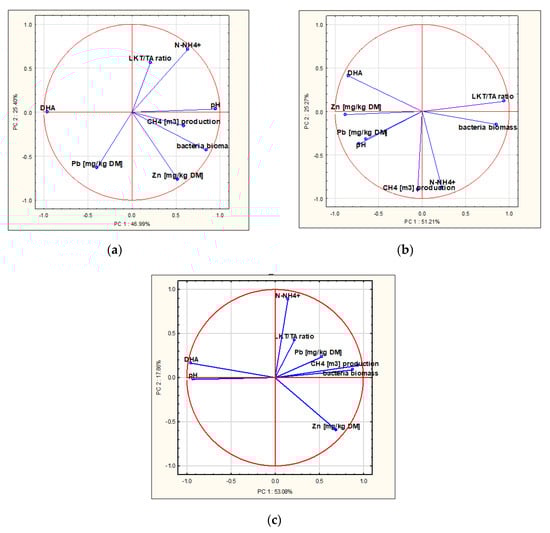 Principal component analysis (PCA) was applied to demonstrate the cause-and-effect relationships between the following parameters: cell biomass, dehydrogenase activity, CH4 emission, N-NH4+, VFA/TA ratio, Zn, Pb (see Figure 16). The PCA demonstrated the regularities between the independent variables. The components being a linear combination of the variables under consideration were determined. The PCA enabled the identification of the initial variables, which constituted a frame of reference for the other variables. It is noteworthy that a considerable amount of variation (over 70%) was explained in the new coordinate system.