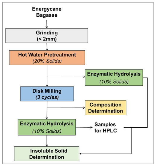 Despite the numerous benefits of energy cane, like every cellulosic feedstock, the biomass recalcitrant structure remains one of the major challenges in its valorization process. Its structure consists of a highly complex matrix of cellulose, hemicellulose, and lignin, and a pretreatment is necessary to break this carbohydrate-lignin matrix to improve enzyme accessibility for efficient degradation. Some recent studies have investigated various chemical pretreatment processes, including dilute acid [5], dilute ammonia [6,7,8], and ionic liquid [3,9], and have reported high sugar recoveries during hydrolysis. However, these processes suffer from several limitations, including sugar loss, inhibitor formation, and the need of corrosion resistant equipment and neutralization along with high cost of the pretreatment reagent. Hot water pretreatment, also known as the “hydrothermal” or “auto-catalyzed” process, is an alternative efficient and environmentally friendly approach in which water acts at a very dilute acid due to the increased hydronium ion concentration at elevated temperatures and pressures [10,11,12]. The process avoids the use of chemicals and the need for specialized equipment; however, it requires about 20–50 °C higher temperature and longer residence times compared with dilute acid pretreatment [12,13]. An important aspect to consider for pretreatment is better recovery of C5 sugars, which are lost with high severity biomass. Hemicellulose ranges from 25% to 35% of lignocellulosic biomass, and has potential and importance in the production of bioethanol, hydrogen, and added value compounds [14]. Although the hydrothermal pretreatment addresses several limitations of chemical process by minimizing the sugar loss and inhibitor formation, the subsequent cellulose conversion efficiencies have been observed to be relatively lower for some feedstocks [12,15,16]. The efficiency can be improved by combining the hydrothermal pretreatment with another physical pretreatment process, such as disk milling, ball milling, or extrusion [15]. Combined hot water and disk milling pretreatment has been observed to be a highly effective, energy-efficient, and cost-effective process to improve the hydrolysis yield of biomass [15,17]. Mechanical refining processes can be used as a standalone pretreatment process also but are highly energy-intensive when processing raw biomass, and the subsequent hydrolysis yields are also relatively lower. The energy required for the grinding/milling of already pretreated biomass (such as hot water or dilute acid pretreatment) could be up to 95% lower than processing raw biomass [12,18]. Combined liquid hot water (LHW) and disk milling synergistically reduce the biomass recalcitrance, increase the surface area, and yield high sugar recoveries during hydrolysis without the need for using chemicals.
