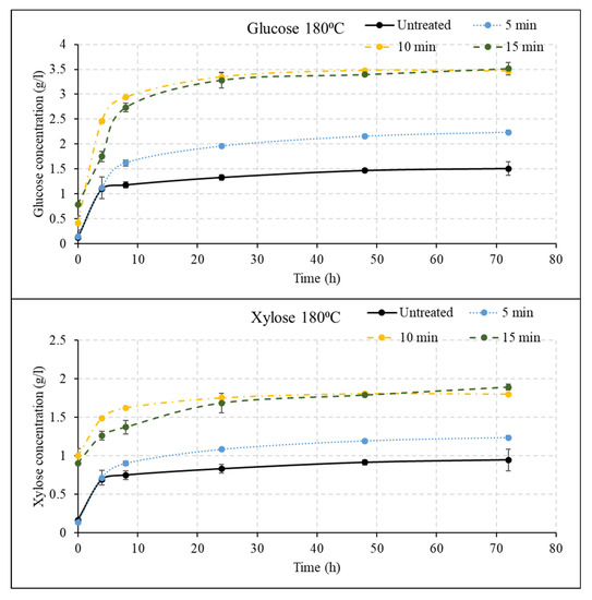 Pretreatment is a key cost center for commercial processing of lignocellulosic biomass; however, it is essential for releasing high sugars for conversion into bioproducts economically on a commercial scale [25]. The pretreatment temperature and time were observed to be critical factors in obtaining high sugar yields in comparison with untreated biomass (p < 0.05). The hydrolysis profile for samples pretreated at 160 °C, 180 °C, and 200 °C are shown in Figure 2, Figure 3 and Figure 4, respectively. At 160 °C, the rate of hydrolysis as well as the final glucose concentration were higher for all three residence times, in comparison with the untreated biomass. The sugar concentration was observed to increase with an increase in time from 5 to 10 min; however, the final glucose concentration for 10 min (2.45%) and 15 min (2.49%) was significantly similar (about 65% higher than the untreated biomass). Xylose concentration, however, did not increase with pretreatment for 5 min (mainly because 5 min was not enough to solubilize enough hemicellulose), but had a significant increase for pretreatment times of 10 and 15 min (44% and 51% higher than the untreated biomass, respectively). The glucose release at the end of the hydrolysis for samples pretreated at 160 °C was measured as 58.29%, 60.18%, and 63.59% for 5, 10, and 15 min of pretreatment, respectively. All the three values were calculated based on the glucose concentration in the pretreated biomass that is left unconverted during pretreatment.