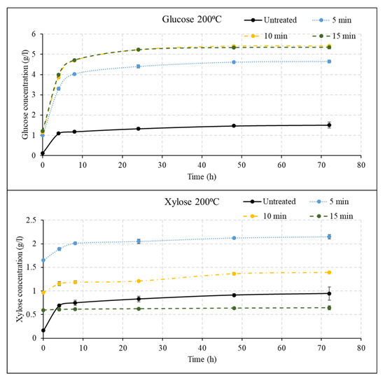 Hydrolysis profile for samples pretreated at 200 °C for 5, 10, and 15 min, followed by disk milling.