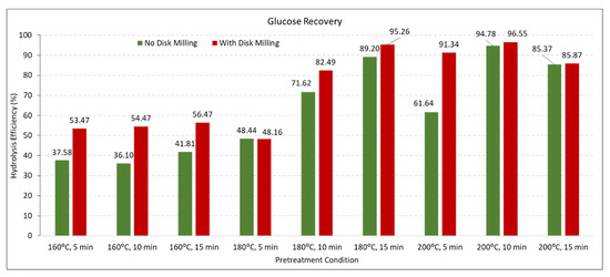 Glucose recoveries based on theoretical unconverted glucose present in the pretreated biomass under different pretreatment conditions are presented in Figure 6. The glucose recovery ranged from 36.10% to 94.78% for non-disk-milled samples, and from 48.16% to 96.55% for the disk-milled samples, with the highest sugar recovery at 200 °C, 10 min pretreatment conditions (SF = 3.94) during hydrolysis. However, in this condition, the recovery from the disk-milled samples was only 1.8% higher than that for the non-disk-milled samples. Similar high glucose recovery was obtained at 180 °C, 15 min (95.26%), which was 6.8% higher than the samples pretreated in the same condition but not disk-milled (Figure 6). The effect of disk milling was more predominant at all times for 160 °C, which has been previously reported [16]. The recovery observed at 180 °C, 15 min and disk milling corresponds to over 98% of the maximum glucose value recovered. Thus, disk milling permitted to achieve almost maximum hydrolysis efficiency while operating at a lower temperature of 20 °C for only 5 min more, highlighting a synergy between the pretreatments that helps mitigate the process conditions.