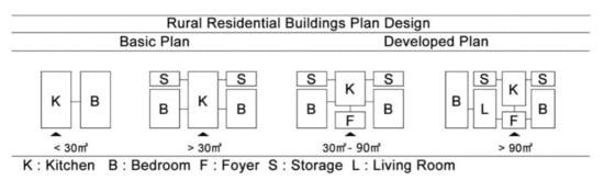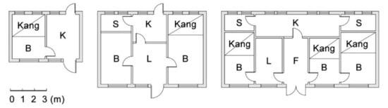 Most of northeast China is in a severe cold region, where temperatures can be as low as −30 °C in winter [25]. To reduce heat losses in this cold climate, the shape coefficients of rural residential buildings in northeast China are minimized [26]. The plans of most rural residential buildings in northeast China are of regular geometry, generally rectangular [27], and most are single-story buildings [28]. There are four typical floor plans of rural residential buildings in northeast China (Figure 1). To meet the resident’s requirements, the floor area is typically between 30 and 70 m2 for basic rural residential buildings. The function of these buildings is simple, consisting of just a bedroom and a kitchen. As the building area increases, the plans focus more on symmetry. To benefit from maximum sunlight, the major living functions are designed to the south, while auxiliary spaces such as storage rooms, are in the north. Since kitchens have both cooking and transport functions, they are often located in the middle. The stoves in kitchens are connected with Chinese “kang” in the bedrooms. According to the family demographic structure and living habits, rural residents adjust the plan designs to a certain extent, but most rural residential buildings in northeast China are still based on the form described above. Due to the lack of independent living rooms and dining rooms in most rural homes, bedrooms are used for sleeping, dining, meeting guests, entertainment, etc.