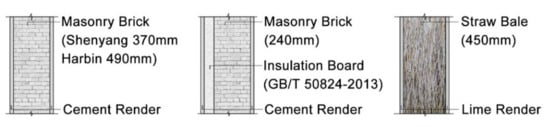 The insulating properties of the wall structure of these rural residential buildings are highly relevant to their energy consumption in northern China [11]. Solid brick construction is the most common in rural regions. The insulating properties of solid brick are poor and solid brick construction generates a large amount of carbon emissions [19]. In contrast, as a by-product of agricultural activities, bio-based wall construction has better insulation properties and lower carbon emissions [20,21]. Researchers have examined the thermal properties of solid brick construction in rural residential buildings [22,23,24]. However, research into the energy sustainability of rural residential buildings with bio-based walls is lacking. Due to the good thermal insulation properties of bio-based wall construction, heating energy requirements can be reduced by replacing existing walls with bio-based walls using in-fill straw bales. Similar trends for heating energy requirements can be estimated through modifications required in existing standards of energy efficiency in rural residential buildings [14].