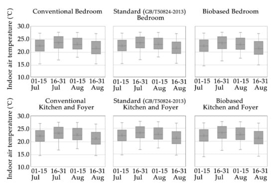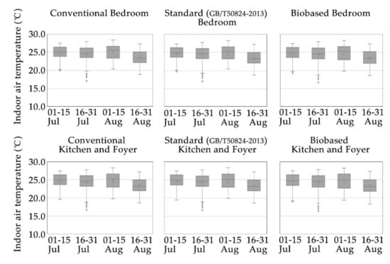For the reference buildings with the three different wall construction types, the indoor environment in the same simulation location showed limited differences during the simulation process. The reference buildings that have a moderate risk of overheating are in Harbin and Shenyang (Figure 5 and Figure 6). The statistical results for the indoor overheating risk are shown in Table 6. In Harbin, the air temperatures occasionally reach over 26 °C in July and temperatures stay over 26 °C for days at the beginning of August. Even though temperatures exceed 26 °C for 17.61% of the time during the summer months, overheating issues may not be problematic in this region. The periods of overheating are mostly during the day when residents are out of the house; hence, the issue is of moderate concern. The overheating days (over 9 h with indoor air temperature above 26 °C) occur over less than a week and there is no continuous overheating period in the summer months. The simulation results showed that indoor air temperatures are higher in the rural residential buildings in Shenyang than in Harbin (Figure 6) and that temperatures exceed 26 °C for 28% of the time in the summer months. The air temperatures exceed 26 °C on a diurnal basis after 10 July and are constantly above 26 °C for more than two days at the beginning of August. There were 10 overheating days (over 9 h with indoor air temperature above 26 °C) during the simulation process. The simulation results showed a total of 21 overheating days in July and August; therefore, overheating issues should be considered in future designs of rural residential buildings in Shenyang. Therefore, mechanical air conditioning units may be required in these buildings, which would result in higher energy consumption in these rural residential buildings.