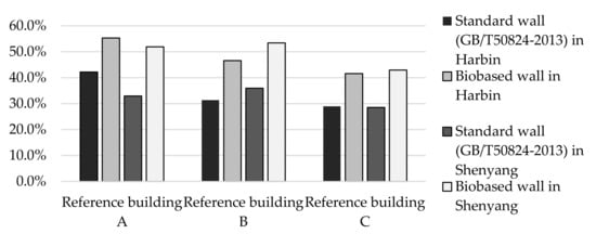 When examining the heating requirements of the reference buildings with conventional wall construction, significant reductions were found in the heating energy requirements for both the standard wall construction to GB/T 50824-2013 and the bio-based wall construction. For the three different residential building types, reductions of 30.48 to 155.72 kWh/m2/year can be achieved by replacing the conventional wall construction of the standard wall to GB/T 0824-2013 and reductions of 45.82 to 204.07 kWh/m2/year by replacing the conventional wall construction by bio-based walls. The largest reductions were achieved in the type A residential buildings with savings of approximately 100 and 150 kWh/m2/year for replacing the conventional walls by bio-based walls and standard GB/T50824-2013 walls, respectively. In the type B and C residential buildings, the reductions are 45.82 to 75.02 kWh/m2/year in the heating requirements achieved by the two modified wall constructions. The bio-based walls achieved savings of 15.34 to 24.46 kWh/m2/year more than the standard wall construction in GB/T50824-2013.