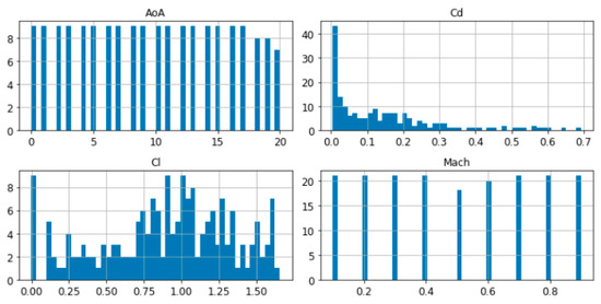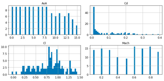 In the case of Cd, the histogram shows a strong concentration of values near to 0, and the Cl histogram shows the main concentration for values between 0.7 and 1.25, especially in the two airfoil databases.