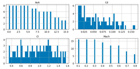 As can be deduced from the pictures above, all the three database were generated with a Latin Hypercube Sampling (LHS) method in parameters AoA and Mach, this is why the histograms show the same bars altitude except for those cases where the CFD solver did not converge (those with highest angles of attack which did not achieve the minimum residual convergence criteria) and were eliminated from the database.
