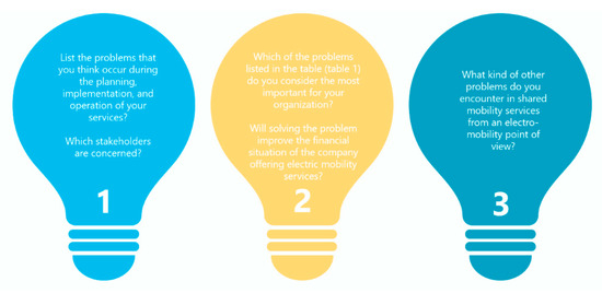 Following the guidelines for conducting expert research presented in [68], the indicated minimum number of experts was a representative sample. In the case of expert research, this result reflects the general publics’ opinion. This type of approach to expert research has been expressed, for example, in the works [69,70,71,72]. The 25 experts were composed of: seven representatives of electric shared mobility operators, eight representatives of local self-government officials, three representatives of SUMP experts, and seven representatives of researchers familiar with shared mobility solutions representing various academic backgrounds (technical universities, universities, and business academies). Twenty-five experts were worked in the group system. According to Arrow’s theory, a group decision support system was used because there is no ideal decision-making mechanism that would allow for a rational selection of group preferences based on individual preferences of individual group members [68]. However, if group members have common goals, appropriate ways of aggregating assessments and opinions from individual members of the expert group may be helpful. Therefore, the group needed to be composed of such a wide range of experts representing various scientific disciplines, branches of the economy, and the public sector. During the work, techniques related to group decision support based on the heuristic methods were used. We proposed a group activating method based on the Gordon’s Techniques that are appropriate heuristic methods for making group decisions [73]. The used method was the Forced Relations Technique, based on a register of characteristics, also called “selective listing” or “attribute listing” [73]. The technique consists of specifying various features related to a given problem and then considering modifying, replacing these elements, and using these elements’ characteristics to obtain better results. It is also used to position problems and match problems to defined sets [73]. Based on the methods’ principles, we proposed a list of factors (problems) connected with the experts’ shared electric mobility markets’ development. After the experts had reviewed the list of problems, they were asked three questions related to the existing problems, problem solving/solutions, and financial aspects. The main questions posed are shown in Figure 2 below.