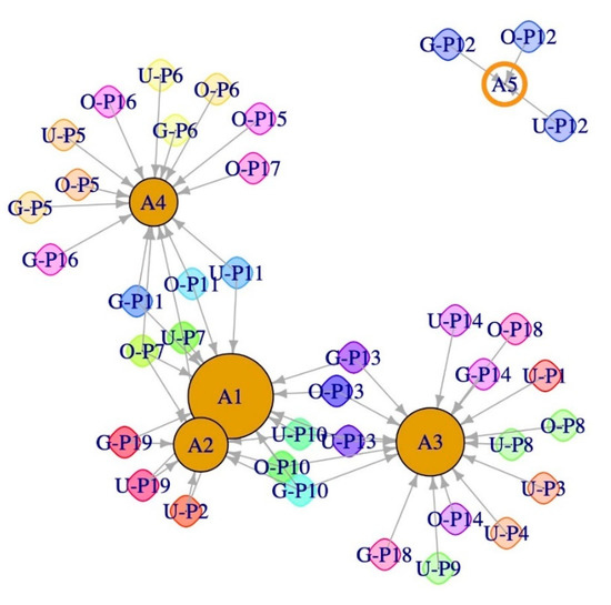 Knowledge of the network structure allows one to establish appropriate management of the individual elements in the network. The sizes of the circles shown in the SNA method indicate the scope of the problems (Figure 4). Only the A5 (others) area has no connection to the rest of the network, which means that problem in this part of the network does not affect proper operation in the rest of the network. The A1 (planning) area has the most considerable impact on the network and is directly linked to the A4 (governance) and A3 (functioning) areas. Combining these areas with existing problems and their proper management will significantly reduce the risk of the incorrect operation of the network in this structure.