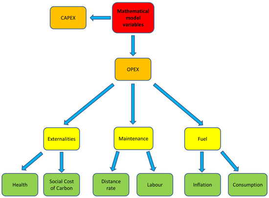 All these challenges have been born in mind to design the mathematical model presented in this manuscript, as well as the calculations and results placed in the next sections. Overall, the model can be described as depicted in Figure 1. The main figures that have been taken into account are acquisition and operational costs, externalities inherent to the vehicle, gas consumption, and maintenance, among others.