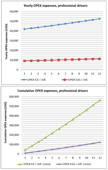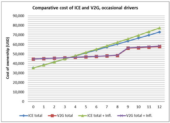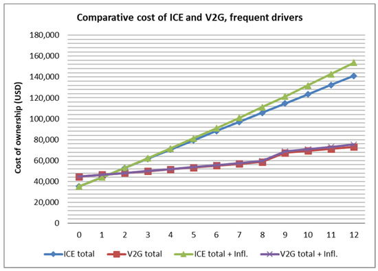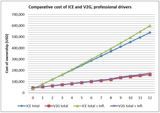 This case study involves people whose main job implies driving or taking passengers in a private-like means of transport (taxi drivers are the most typical example). This kind of job implies that there will be high costs in consumed fuel and maintenance for ICE-based vehicles. As represented in Table 3 and mentioned earlier, the costs and usage for professional drivers have been calculated considering those according to [53], namely, the yearly average consumption of gas is 2813 [63]/524 [67] = 5.368 times the one made by the frequent drivers even if, as mentioned before, there are cases where taxi cabs are driven up to 70,000 miles per year [45]. The following figures, adjusted to inflation, have been obtained:
