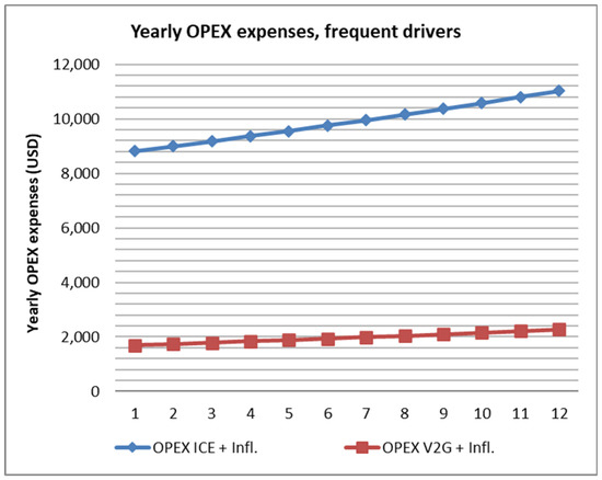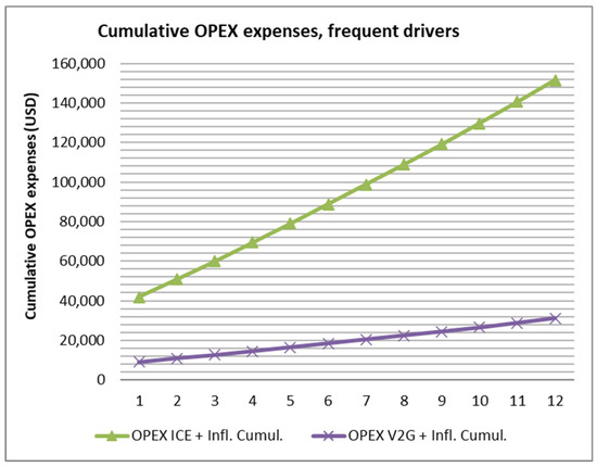 If the results that have been obtained are separated so that operational costs can be considered more accurately, it can be seen how despite a) a higher Capex if an EV is purchased; b) the required infrastructure to make the EV work as a V2G solution; and c) a battery renewal, the operational costs of the ICE vehicle are far higher in this scenario starting from year 1, mostly but not only, due to the maintenance costs required to have the ICE working satisfactory. This is the key advantage that the V2G solution has, which makes it economically far more advisable under these circumstances if compared to the ICE alternative. The graphical comparison of Opex costs has been displayed in Figure 3. Note that the battery replacement has been included as an Opex-related expenditure, so it is present in the cumulative figures. Moreover, it is considered that the first year of usage (year 0 in the previous graphs) there are not operational costs, which start being added at year 1. That is why this and the other equivalent graphs show year 0, whereas Opex-related ones do not.