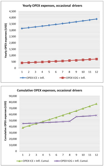 As mentioned previously, Figure 5 depicts the differences in operational costs between the V2G and the ICE vehicle. Albeit with a smaller gap resulting from the lesser usage of the automobiles, the results are essentially replicated for this case study: yearly expenses, and cumulative ones when the battery replacement costs are included, are lower for the V2G than the ICE vehicle.