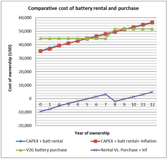Although it is not bound to happen inevitably, the battery used in the EV-V2G is very likely to eventually have to be replaced. However, it does not necessarily mean that the vehicle owner will pay for the full replacement if the vehicle has been acquired under a battery leasing agreement. Therefore, there are two possible options: if the vehicle and the battery are purchased, battery replacement costs will have to be considered; with the technology available today in commercial products, it is unlikely that a vehicle battery will outlive the vehicle itself. The other option, though, is that the vehicle manufacturer leases the batteries to the vehicle owner during a certain time period. In this way, battery reposition could be regarded as a periodic payment () done during the lifetime of the vehicle. This latter scenario is modelled in (17) as ; while this is not the default choice for consumers buying an electric vehicle, it is a feature usually overlooked in other models for V2G, so it has been included in this analysis. When price data are used to estimate the cost differences between acquiring and leasing the battery in the V2G, would be used as the maintenance cost for rented batteries, whereas Batr, added in (19), will be used as the parameter representing the cost of a battery replacement when the battery is purchased with the EV.