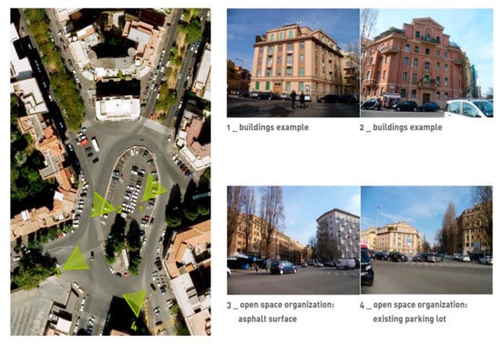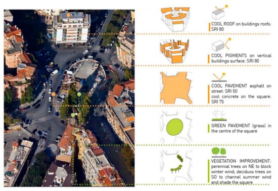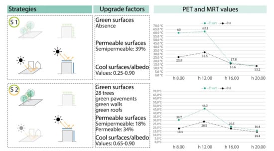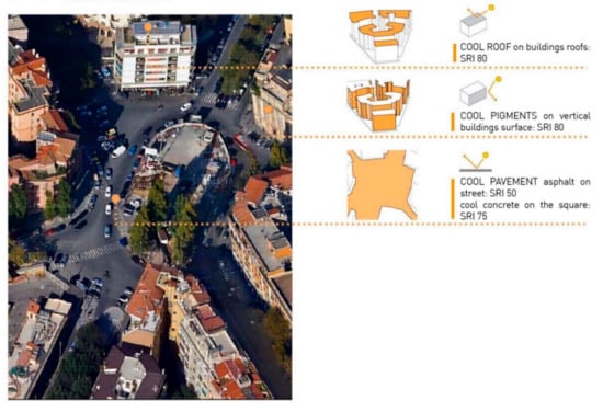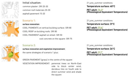 Afterwards, different possible indicators were considered that could describe the microclimatic conditions and the thermo hygrometric comfort of the site, operating through Mean Radiant Temperature (MRT), and Physiological Equivalent Temperature (PET). The first parameter measures the average of temperatures for surfaces in an environment that are involved in a radiating thermal exchange and it represents the influence of the urban reservoir, the morphological system, and the materials on microclimate []. The second indicator, specifically developed for exterior spaces, defines the temperature as users perceive it, taking into account overall environmental meteorological factors, thermal balance, and thermoregulation processes of the human body, and therefore delivering a comfort value estimate that can easily be understood. Its accuracy, together with the other outdoor comfort indexes, has recently been questioned since it underestimates the strong adaptation capability of users to variable outdoor conditions and therefore it may result in an excessively negative evaluation compared to the actual perceived sensation; despite this, the PET allows us to define at least the trend of comfort with a fair amount of accurateness. The next step was to analyse the possible space morphological transformation strategies that can be applied to the specific context; since it was impossible to perform invasive actions variations on surfaces, integration of vegetation was considered. The possible actions operable on surfaces include: exterior paint or substitution of plaster coating on facades and roofs and the introduction of new materials on roofs and paving systems; allowing both colour variation and innovative systems such as “cool pavements” and “cool pigments” that present a high reflecting coefficient and high emissivity which lower heat gain. Moreover, it is possible to hypothesize the implementation of green areas in punctual, linear, and spread configurations of ground cover or trailing vegetal elements.