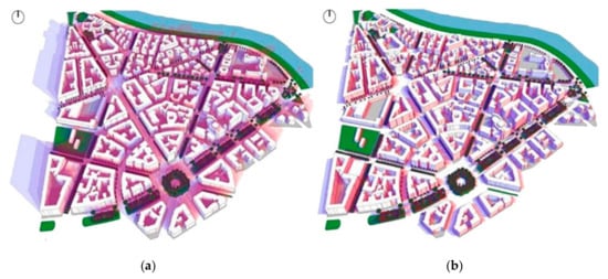 Prati area shadow factor: (a) Winter shading analysis based on 21 December, with analysis range 9–12 (blue) 12–15 (red) hours and step 120 min; (b) Summer shading analysis based on 21 June, with analysis range 9–12 (blue) 12–15 (red) hours and step 120 min (analysis software: ECOTECT ANALYSIS 2010, software preset grid cell dimension).