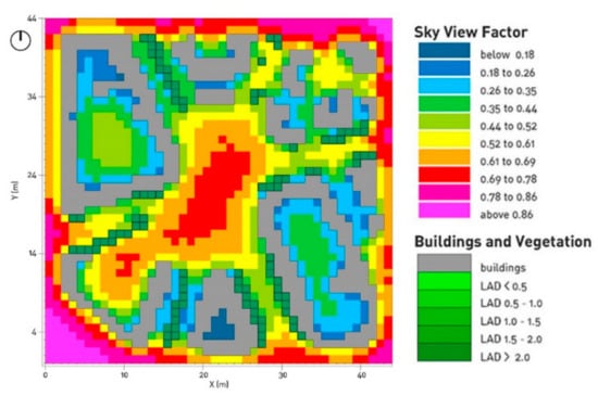 The input value in summer and winter are the same used for ENVI-met. The SVF, one of the main features of RayMan, was determined with ENVI-met. At the same time, the Leaf Area Density (LAD) was calculated with ENVI-met (Figure 3).