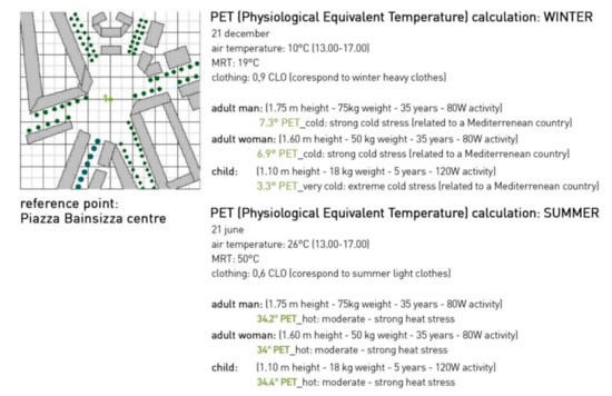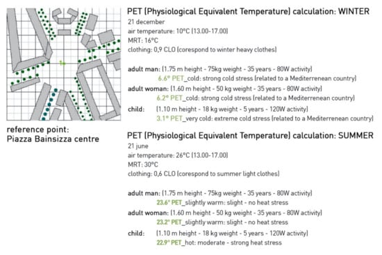 The evaluation of outdoor thermal comfort was calculated (with RayMan) through the PET index (physiological equivalent temperature) defined as the air temperature at which, in an indoor environment (without wind and solar radiation), the heat balance of the human body between the internal temperature and that of the skin is balanced with the outdoor conditions to be assessed.