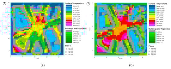 Scenario 1 surface temperature and wind speed analysis: (a) Winter analysis based on 21st December at 3:00 p.m.; (b) Summer analysis based on 21st June at 3:00 p.m. (analysis software: ENVI-met 3.1).