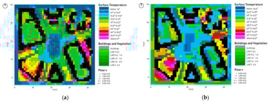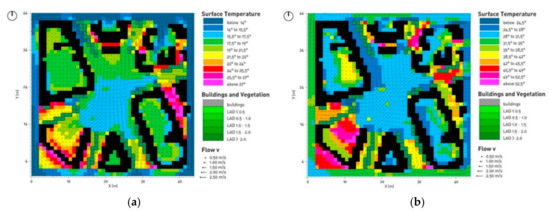 Piazza Bainsizza surface temperature and wind analysis: (a) Winter simulation based on 21st December at 3:00 p.m.; (b) Summer simulation based on 21st June at 3:00 p.m. (analysis software: ENVI-met 3.1).