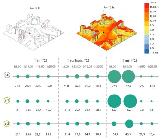 In scenario 1, during winter, using a cool pavement and cool pigments and building materials, there is a slight decrease of surface temperature, as heat storage in urban fabric is reduced (Figure 9a). Meanwhile during summer (Figure 9b), cool materials use really improves microclimatic comfort by decreasing surface temperature up to almost 10 °C; however, direct radiation is still very high due to the complete lack of shading surfaces.