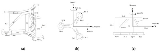 where , , , and are the number of heave plates, pontoons, center columns, side columns and braces, and indicate the diameter and height of heave plates without the skirts, and are the length and height of pontoons without the skirts and , and are the diameters of center column, side column and brace. and are the heights of center column and side column, is the length of brace and represents the angle between the axial direction of element and the global X coordinate, as described in Ishihara and Zhang [20].