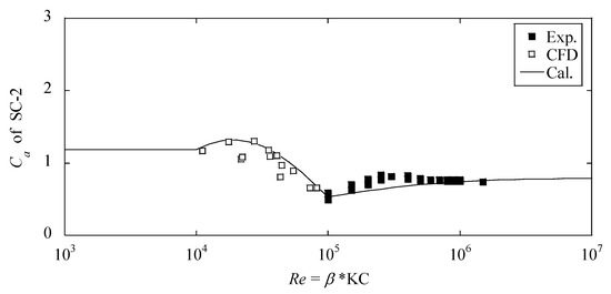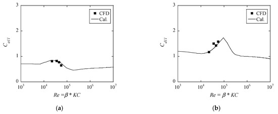 The global added mass and drag coefficients predicted by the proposed model is compared to those obtained from the numerical forced oscillation test by Pan and Ishihara [19], which showed good agreement with the experimental data from the water tank tests. The numerical simulations were conducted at four Reynolds numbers in the surge direction and three numbers in the heave direction. The global added mass and drag coefficients in the surge and heave directions from CFD are calculated according to Equations (8) and (9). The global hydrodynamic coefficients from the proposed formulas are calculated by Equations (14) and (15).