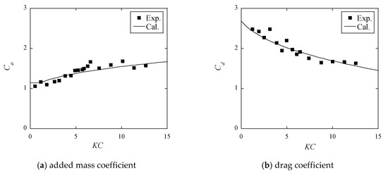 where is the drag coefficient of cylinder obtained from the forced oscillation test, means the drag coefficient of cylinder measured in the steady flow and both and are the functions of Reynolds number. and denote the relative velocity and current velocity, respectively. In the wave-only and current-only conditions, the drag forces by the proposed formula are the same as those calculated by Equation (21). In the combined wave-current condition, the current-induced drag forces are calculated using from the steady flow, while the wave- and motion-induced drag forces are predicted using from the forced oscillation test.