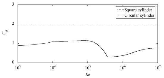 Figure 6 shows the variation of drag coefficients of circular and square cylinders with Reynolds numbers in steady flow, which are obtained from the experiments [9,13]. The drag coefficient of the circular cylinder increases as Reynolds numbers increases, reaches a maximum, and then gradually decreases and approaches a constant value. The drag coefficient of the square cylinder has a constant value of 2.0. The formulas for in the steady flow are summarized in Table 3.