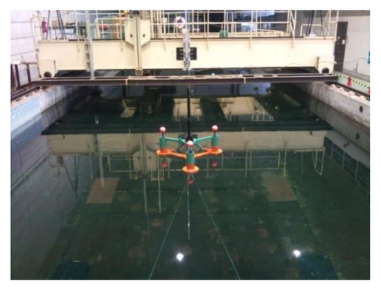 The dynamic responses of the platform for the 1:50 scale model [10] in the wave and current conditions are studied. Figure 8 shows an overview of the water tank and platform. Figure 9 presents the arrangement of the experiment and layout of the mooring lines. The platform motion and the mooring tension are measured in the experiments. The wave elevation is measured by two wave height meters, which are installed upstream and beside the platform. A current meter, which locates downstream, records the current velocity. Table 4 provides the environmental states in the experiments. In the free decay tests (Case 1), the natural periods of six degrees of the motion are measured first. The responses of the platform in the current-only (Case 2) and wave-only conditions (Case 3 with regular waves and Case 4 with irregular waves) are then investigated. Finally, the dynamic responses of the platform in the combined wave-current conditions (Case 5 with regular waves and Case 6 with irregular waves) are examined.