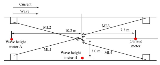 Arrangement of the experiment and layout of the mooring lines in the wave and current conditions.