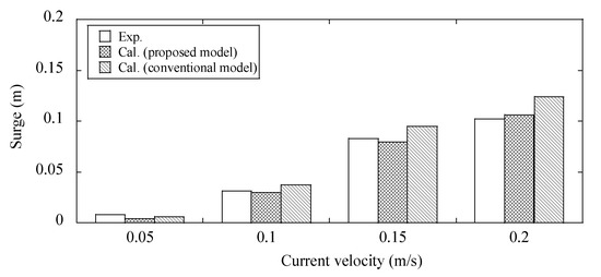 Figure 10 presents comparison of the predicted and measured mean value of the surge in the current-only condition. It is found that the conventional model using obtained from the oscillatory flow overestimates the surge, while the proposed model matches well with the experimental data. It is attributed that the proposed model calculates the current loading according to obtained from the steady flow, which is smaller than obtained from the oscillatory flow at the Reynolds number in the experiment.