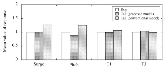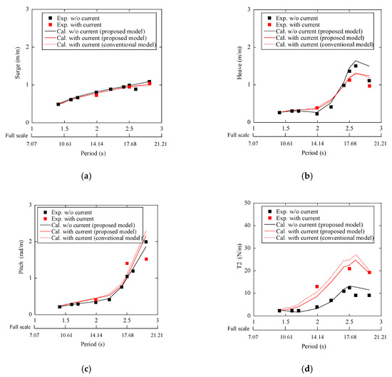 Figure 12 shows a comparison of the predicted and measured response amplitude operators (RAOs). The RAOs of the surge, heave and pitch motions as well as the mooring tension in the wave-only and combined wave-current conditions are calculated. In the water tank tests, the responses at 9 wave periods in the wave-only condition and at 3 wave periods in the combined wave-current condition are examined and used for validation of the proposed model. Since the proposed model is the same as the conventional model in the wave-only condition, only the predicted dynamic responses by the proposed model are shown in the figures. In the combined wave-current condition, the predicted dynamic responses by both models are plotted in the figures for comparison.