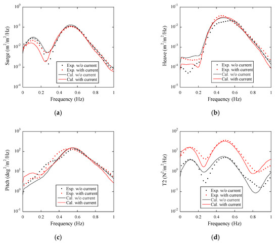 The dynamic response of surge motion illustrated in Figure 12a shows similar values for the cases with and without the current since the experiments near the natural period of the surge motion are not conducted due to the limitation of the water tank. The dynamic responses of heave and pitch motions in the case with the current as shown in Figure 12b,c are smaller than those in the case without the current, while the dynamic responses of mooring tension as illustrated in Figure 12d increases in the case with the current. The current increases the velocity of water particles passing through the pontoon, which leads to the increment of damping in the vertical direction. The current also moves the equilibrium position of the platform to the downstream and results in the increase of the tension of upstream mooring line and affects the pitch response. It is suspected that this is caused by the change of mean tension of the mooring line and the equilibrium position of pitch. It is noticed that the conventional model using obtained from the oscillatory flow slightly overestimates the response of the mooring tension due to the overestimation of mean values of surge and pitch motions, as shown in Figure 11, while the proposed model shows favorable agreement with the experimental data.