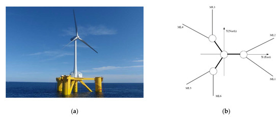 2 MW semi-submersible FOWT used in the Fukushima demonstration project. (a) Overview of full-scale platform and (b) configuration of mooring lines.