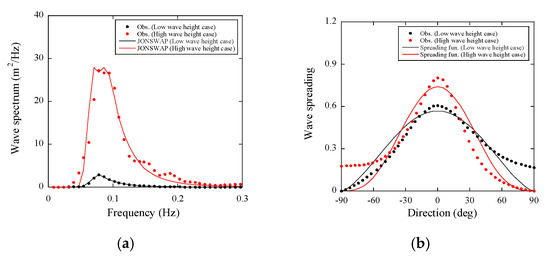 Comparison of the (a) frequency spectrum and (b) directional spreading between the observed and simulated wave at low and high wave height cases.