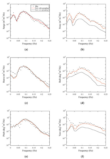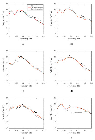 Two numerical simulations without and with the spreading function are then conducted. The PSDs of the platform motions for the low wave height case are given in Figure 17. The dynamic responses are normalized by the squared significant wave height. In this case, the wave direction is close to the surge direction and the spreading function strongly affects the motions in the sway, roll and yaw directions. Without consideration of directional spreading of the wave spectrum, the sway, roll and yaw motions are significantly underestimated. The PSDs of platform motions for the high wave height case are shown in Figure 18. The effect of the spreading function on the dynamic responses of platform motions is relatively small in this case, since the primary wave direction is located between the surge and sway directions, while the improvement for the yaw motion by the spreading function is significant, as shown in Figure 18f. The low-frequency peaks observed in the PSDs of platform motions in the surge and sway directions, as illustrated in Figure 18a,b, correspond to the natural frequencies in these two directions. The low-frequency peaks are not obvious in the PSDs of platform motions in the heave, roll and pitch directions, as shown in Figure 18c–e, since the natural frequencies in these directions are close to the peak frequency of the wave. The dynamic responses of 2 MW FOWT in the six degrees of freedom are well predicted by the proposed hydrodynamic models.