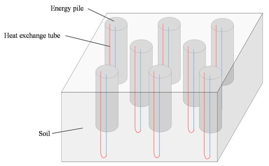 Schematics of the energy pile group embedded with a deeply penetrating U-shaped heat exchanger.
