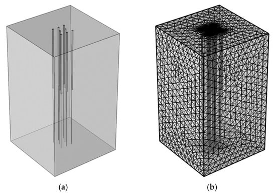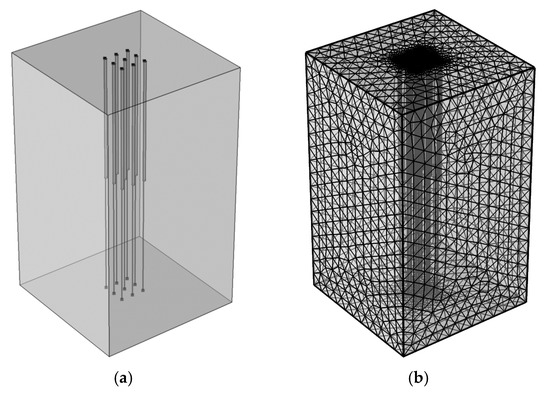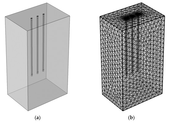 To validate the numerical model for a pile group, a group of three parallel piles was simulated against You et al.’s [29] in situ experiments. In situ experiments of cement-fly ash-gravel energy piles were conducted at a testing field in Shunyi, Beijing. The piles had a diameter of 0.42 m, a length of 18 m, and a spacing of 2 m. Three piles connected in parallel were tested after the pile temperature had returned to the original soil temperature. More details on the parameters of the energy pile group are presented in Table 4 (data from You et al. [29]). The material properties are consistent with those presented in Table 1, according to Carotenuto et al. and You et al.’s work [29]. The geometry model is presented in Figure 4a, and the mesh distribution is presented in Figure 4b. The boundary conditions are the same as in Figure 3. Overall, there is good agreement between the present study and You et al.’s work. Taking the central pile as an example, according to Table 5, the outlet water temperature is 32.85 °C in this study, and the temperature variation between the inlet and outlet is 2.15 °C, while the temperature difference is 1.96 °C in You et al.’s work. The slight difference between the present study and the experimental data can be due to the uncertainty in the values employed for the thermal properties of the soil, which is composed of several layers.