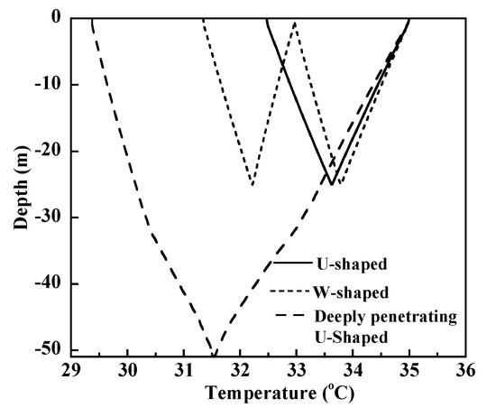 - Compared with the U-shaped and W-shaped configurations, a deeply penetrating U-shaped configuration involves deeper soil, and as the temperature difference between deep soil and water is greater than that between shallow soil and water, the heat exchange is more effective at deeper soil levels for a deeply penetrating 1-U shaped configuration;