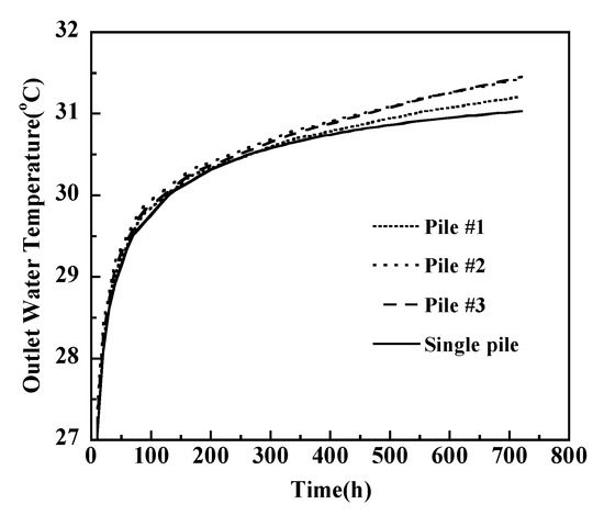 According to Figure 9, in the first 300 h, the outlet water temperatures of Piles #1, #2, and #3 were nearly the same and had negligible differences from the single pile. This indicates that 300 h is not long enough to cause thermal interference. After 300 h, however, the difference became more evident. After 720 h, the outlet water temperatures of Piles #2 and #3 were nearly the same (31.43 °C and 31.45 °C), while that of Pile #1 was slightly lower (31.21 °C). The heat transfer rate of Pile #1 is 6.2% and 6.8% higher than that of Piles #2 and #3, respectively, because the thermal interference at the corner (Pile #1) was not significant compared with that at the side (Pile #2) or that at the center (Pile #3).