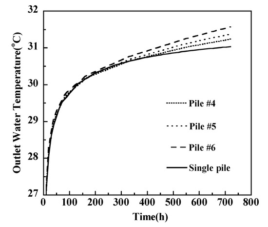 According to Figure 10, in the first 300 h, Piles #4, #5 and #6 have negligible differences from the single pile. This also indicates that 300 h is not long enough to cause thermal interference. After 300 h, thermal interference becomes evident, which causes a decrease in the heat transfer capacity. After 720 h, Pile #6 (at the center) had the highest outlet water temperature of 31.57 °C. Pile #5 (at the side) had the second highest outlet water temperature (31.37 °C), and Pile #4 (at the corner) had the lowest outlet water temperature (31.23 °C). Meanwhile, the outlet water temperature of the single pile is 31.03 °C, which is lower than that of all the piles in the group. The corner pile indicates a heat transfer rate 9.9% higher than the central pile. The reasons are as follows: the thermal interference increases with increasing operating time. Pile #6 is at the center and thus subject to the greatest thermal interference from surrounding piles. Pile #4 is at the corner and thus subject to the least thermal interference.