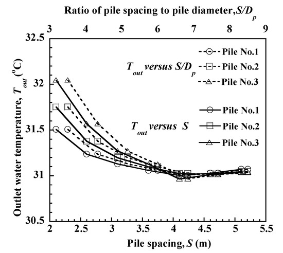 The pile spacing, S, which is the center-to-center distance between adjacent piles, is one of the most important parameters affecting the thermal performance of an energy pile group with a deeply penetrating U-shaped heat exchanger. In practical projects, pile spacing falls within a range, usually four to six times the pile diameter (data from Chinese code for design of building foundation, GB50007-2011). However, in this study, the range of pile spacing is enlarged (as presented in Table 8) to obtain more general conclusions. The outlet water temperature after 720 h of operation as a function of pile spacing for three piles in the group is presented in Figure 11 and Table 9. As indicated, an increase in the pile spacing leads to a decrease in the outlet water temperature for all three piles, which implies that more heat is transferred into the soil. When the pile spacing is 2.1 m (i.e., 3.5 times the pile diameter), the outlet water temperature difference of the three piles is at its maximum of 0.54 °C. The corner pile indicates a heat transfer rate that is 18.3% higher than that of the central pile. As the pile spacing increases, the outlet water temperature difference of the three piles also decreases. When the pile spacing is 4.1 m (i.e., 6.8 times the pile diameter), the difference of the three piles approaches 0. The outlet water temperatures of the three piles are 31.00 °C, 31.02 °C, and 30.96 °C, which are close to the results of the single pile, 31.03 °C, presented in Figure 11 and Table 9. When the pile spacing is larger than 4.1 m, the outlet water temperatures of the three piles stabilize and match that of a single pile. Purely from the standpoint of thermal performance, the pile spacing is recommended to be more than 6.8 times the pile diameter to reduce the influence of the pile group on the heat transfer capacity. However, in practice, we need to combine the mechanical analysis and site limitations to determine a rational pile spacing. For example, a nonenergy pile can be set up at the middle of two adjacent energy piles to double the pile spacing between energy piles and increase the heat transfer capacity of every energy pile, and only half of the energy pile is needed.