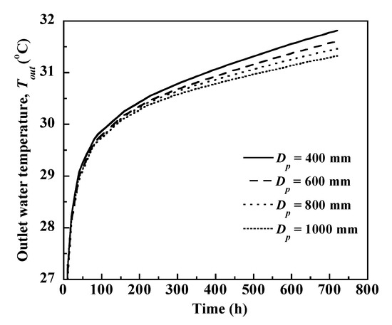 Outlet water temperature variation for different pile diameters, Dp.
